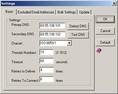 Please use following dns server if your local DNS server can't work. One line per DNS. You can use copy paste to enter it into [Settings->DNS server] of our bulk email program. After entering, you may need to click [Settings->Test DNS] to make sure it work on your PC. And then, click [OK] to save settings.